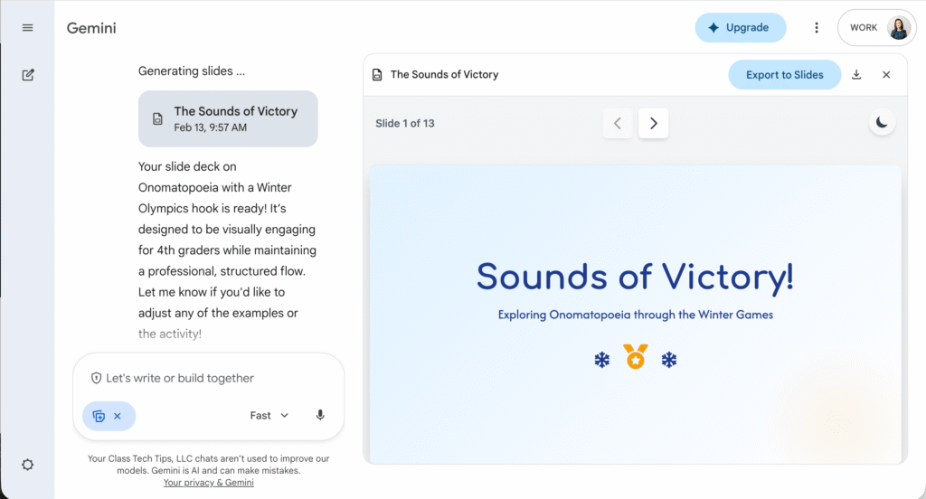 Gemini pulls together relevant images and creates content slides that weave literary devices into sports examples. It’ll even make placeholder slides when I ask it to include brain breaks or turn-and-talk moments. You can upload reference material if you like, such as a lesson outline. You can also use the voice-to-text feature to dictate your request, which is sometimes a faster way to get started.
